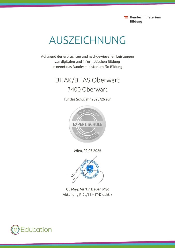 Unsere Schule wurde vom Bundesministerium für Bildung als „EXPERT.SCHULE“ ausgezeichnet.