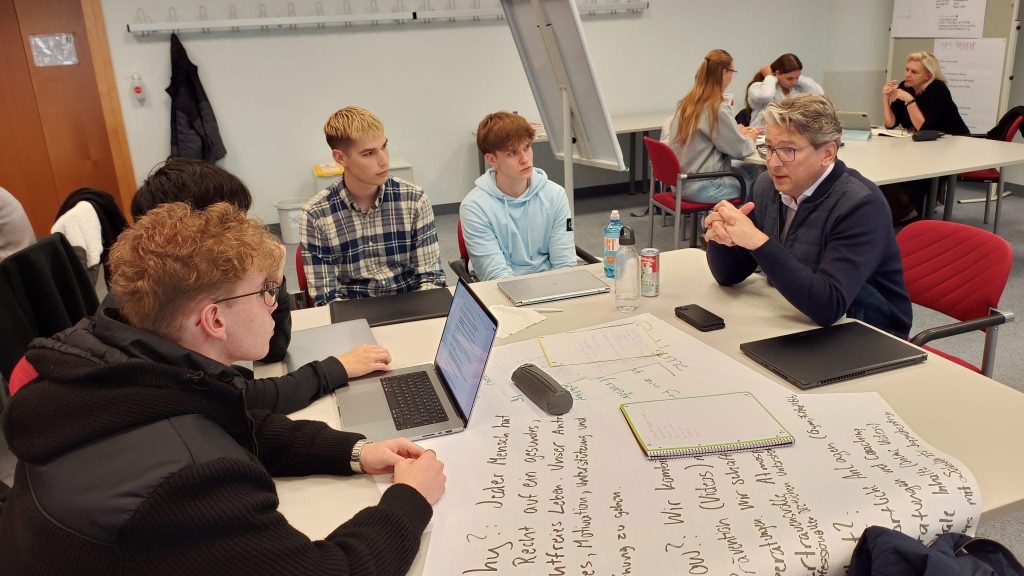 Am Mittwoch erhielten die Teams wertvollen Input aus der Praxis: Vertreterinnen und Vertreter der Wirtschaft – Eva Burtscher, Tanja Stöckl, Christoph Winkler, Jürgen Beiglböck, Marcel Pomper und Thomas Oswald – teilten ihr Know-how und gaben den Schülerinnen und Schülern in individuellen Coachings hilfreiche Impulse für die Weiterentwicklung ihrer Projekte.